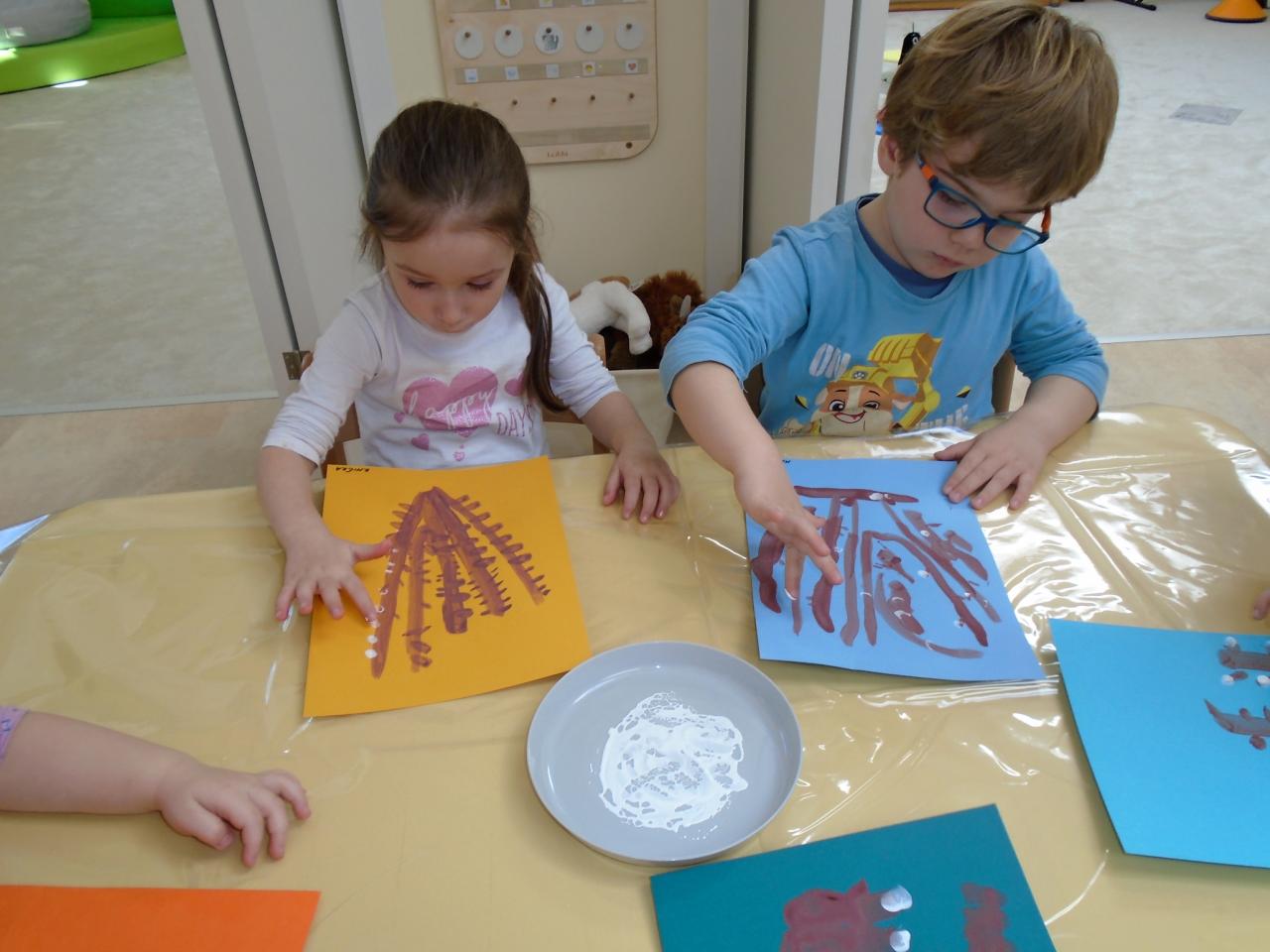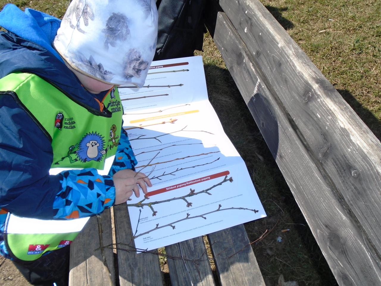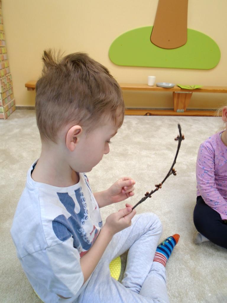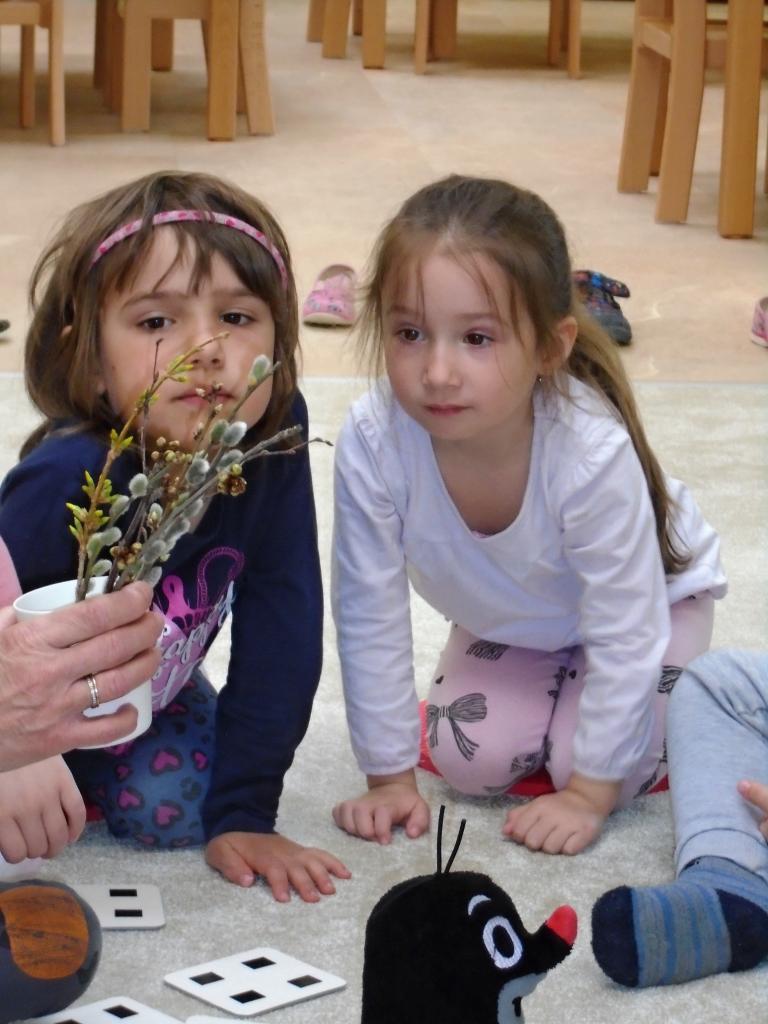 Děti si vyslechly motivační příběh o Krtkovi, společně se zvířátky odháněly zimu a přivolávaly jaro říkadly a písničkou NA JAŘE, vydaly se do přírody hledat jaro, pozorovaly pomocí lup rašení pupenců na větvích stromů a keřů, poslouchaly zpěv ptáků, malovaly prstem KOČIČKY a třídily obrázky se symboly ZIMY a JARA