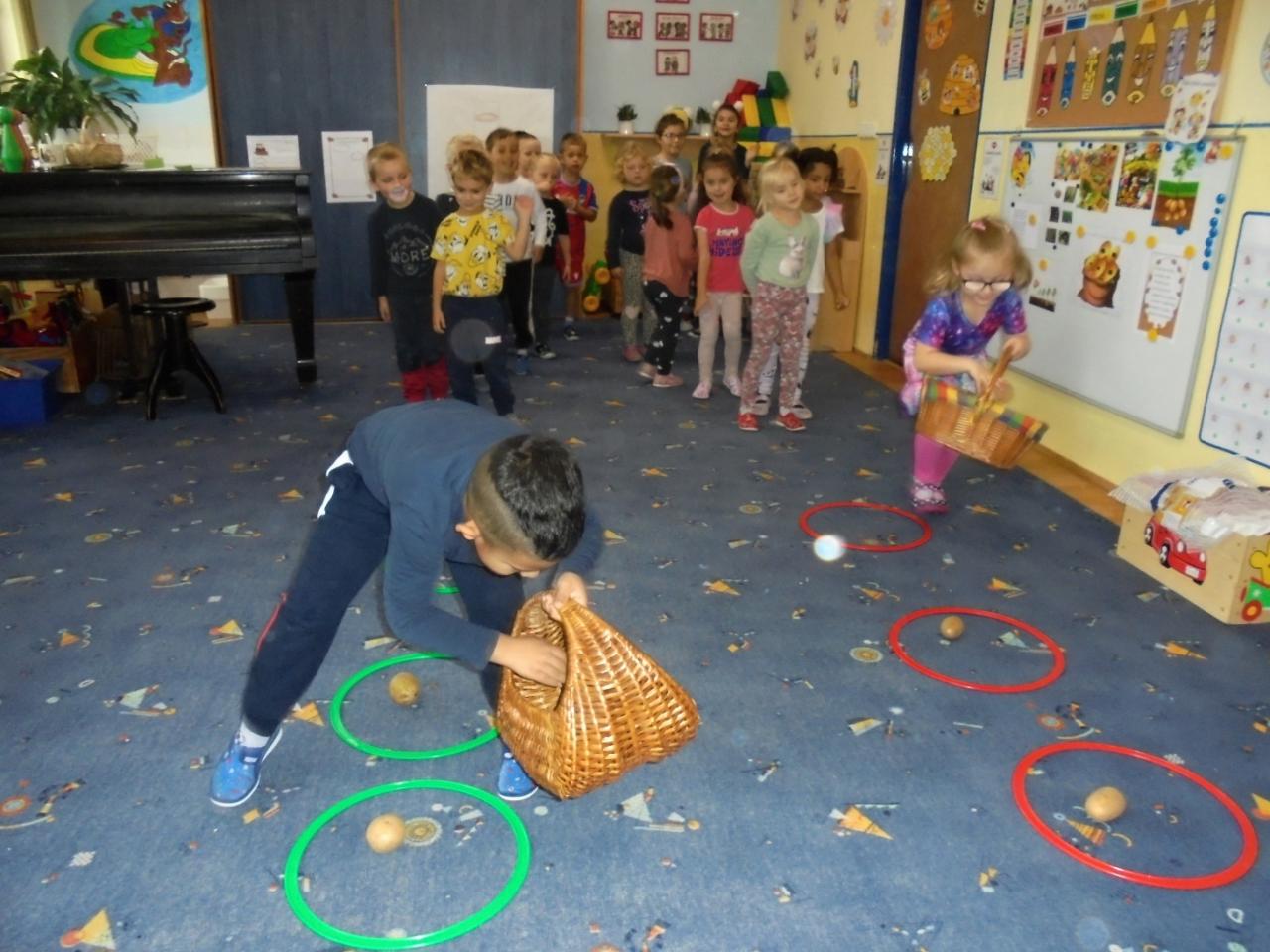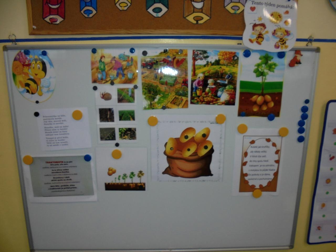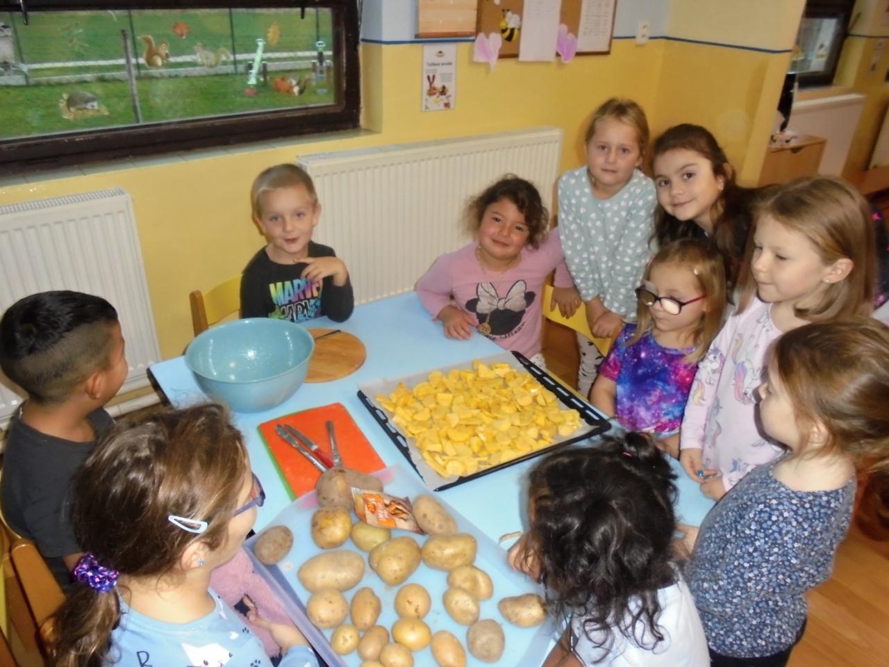 Děti vyslechly pohádku "O drakovi, který měl rád brambory", pracovaly s textem a společně diskutovaly. Navlékaly korále pro princeznu, seznámily se s písničkou "jedna, dvě,.......co s to Janku sněd" a doprovodily se hrou na ozvučná dřívka, zopakovaly si slyšený rytmus. Vyzkoušely si sklizeň brambor (sázení, sbírání brambor, skákání v pytly, převaly, svážení brambor na trakaři, třídění brambor dle velikosti). Týden uzavřely hudebně-pohybovým představením "Štrůdlování a brambobraní"