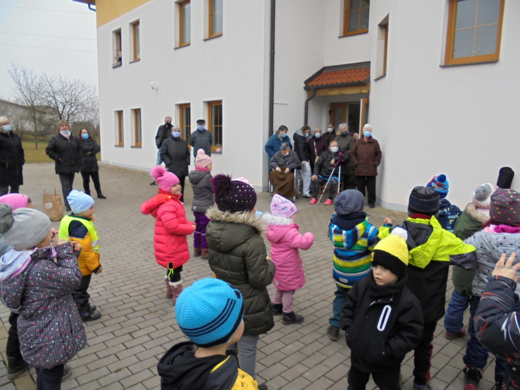 Protože dnešní doba není lehká, přinesly děti ze třídy A a C trochu radosti do domova seniorů ve Zbůchu. I přes ztížné podmínky se vystoupení venku velmi vydařilo. Děti zatančily a zazpívaly a nejedno oko babiček a dědečků nezůstalo suché. Sladkou odměnu jsme nečekali, ale moc za ni děkujeme!!!